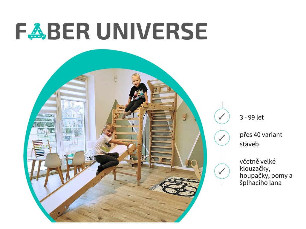 Lezecké desky, madla M1 a zakončení klouzačky nejsou součástí FABER Universe.