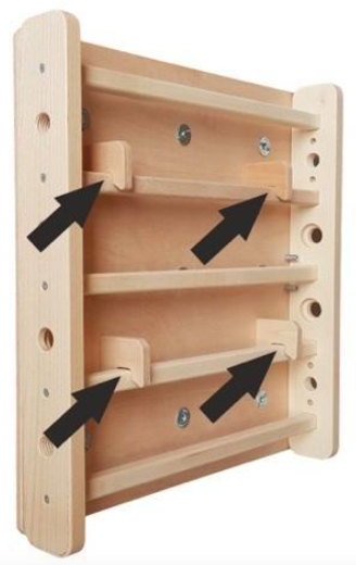 1) Lezeckou desku jednoduše zaháknete na panel. Vždy se ujistěte, že deska visí na všech čtyřech hácích, které plně dosedají na tyče panelu.