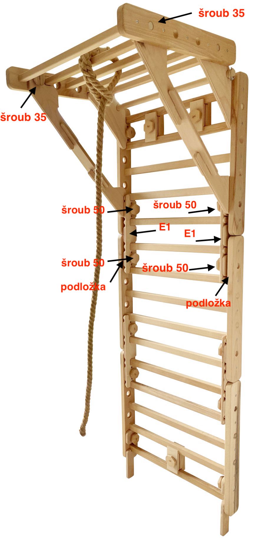 b) máte žebřiny – na uchycení vzpěry budete potřebovat tyto díly: 4 x šroub 50, 1 x pár podložky (tyto díly je nutné samostatně dokoupit).