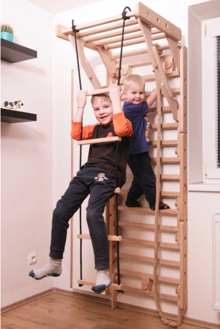 Stavba je upevněna do zdi pomocí tří spojek W1. Součástí sady je vzpěra hrazdy H1, která zvyšuje nosnost stavby až na 75 kg! Pohoupat se tak mohou klidně i rodiče.